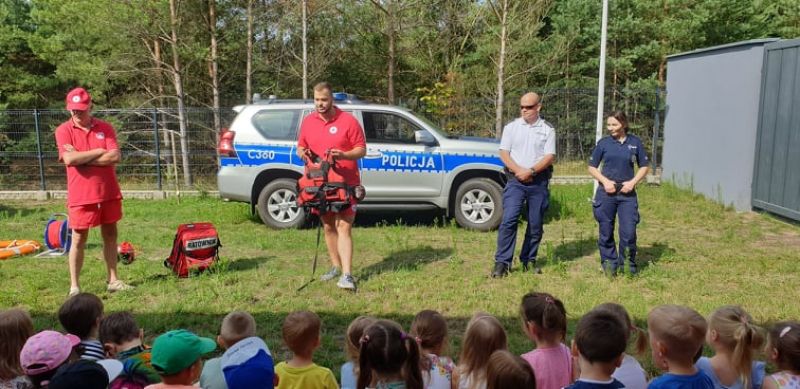 Dnia 16 lipca br. odwiedziło nas Wodne Ochotnicze Pogotowie Ratunkowe. Nasi goście przypomnieli nam o zasadach bezpieczeństwa podczas pobytu nad wodą. Dodatkowo opowiedzieli o swojej pracy. Świetną atrakcją było to, że mogliśmy wsiąść na motorówkę ratowniczą oraz pogłaskać psa policyjnego. Dziękujemy bardzo!