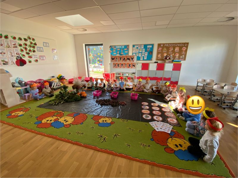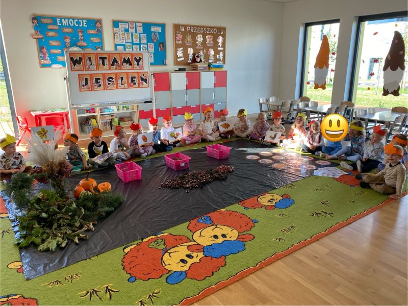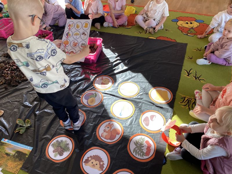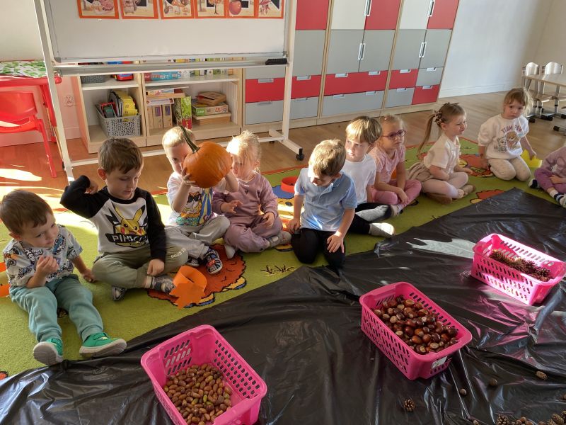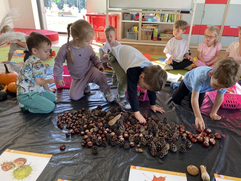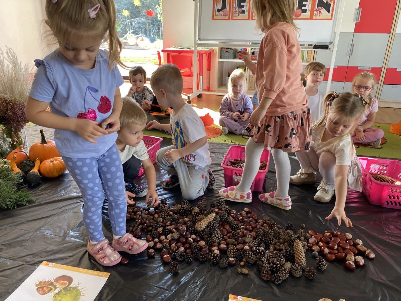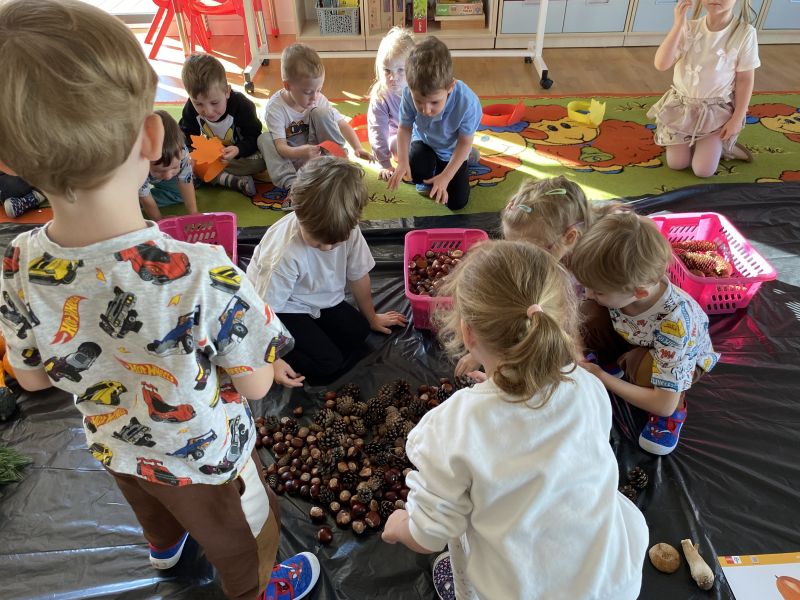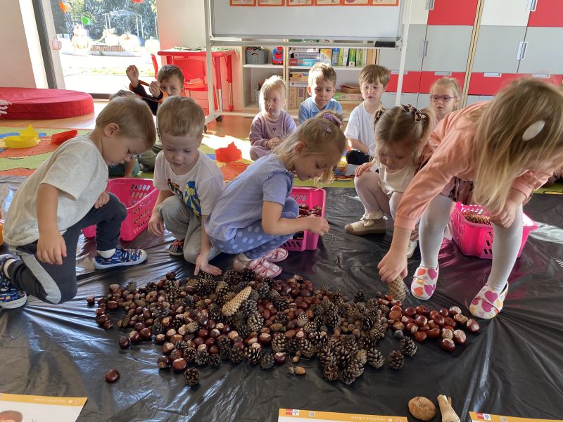 Przedszkolaki przywitały Panią Jesień, która przygotowała różne dary: kasztany, szyszki, żołędzie, liście. W ten sposób powitaliśmy nową porę roku!