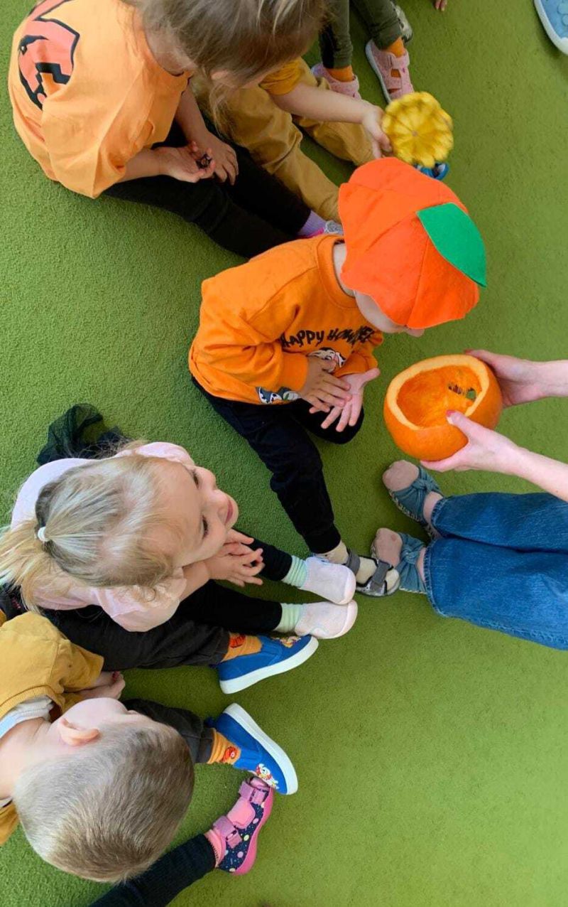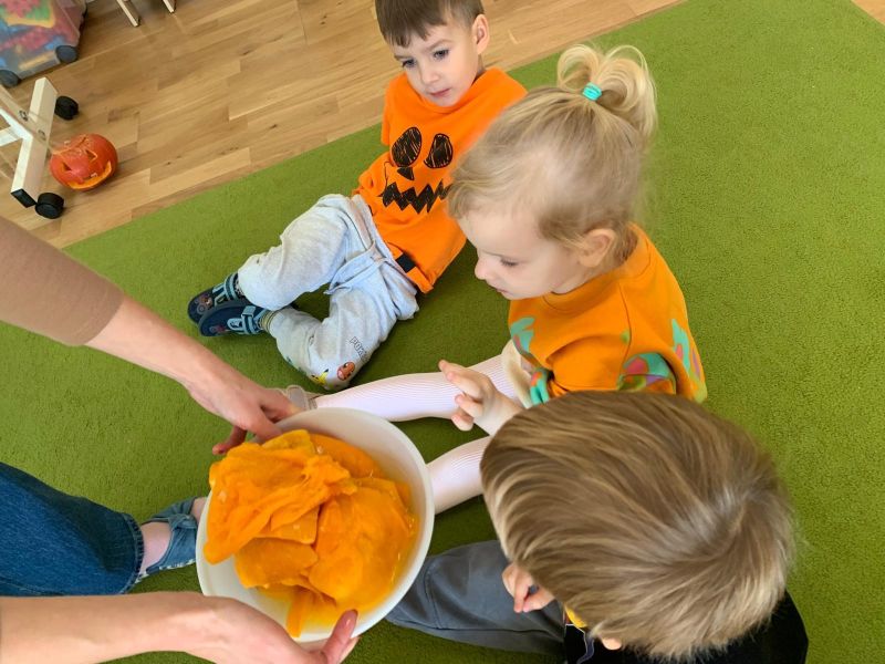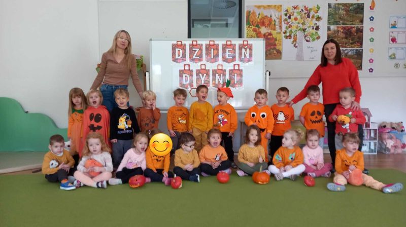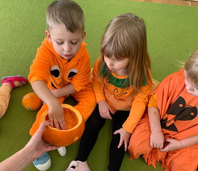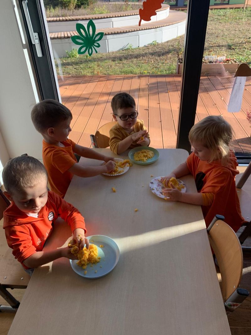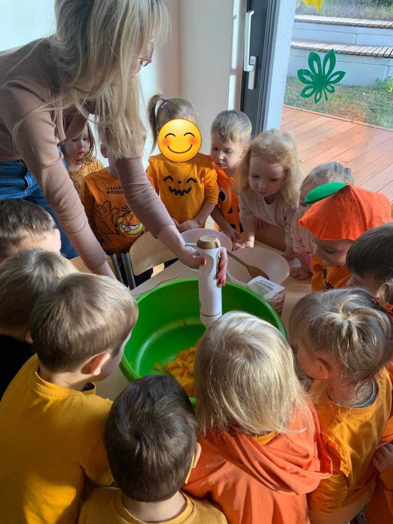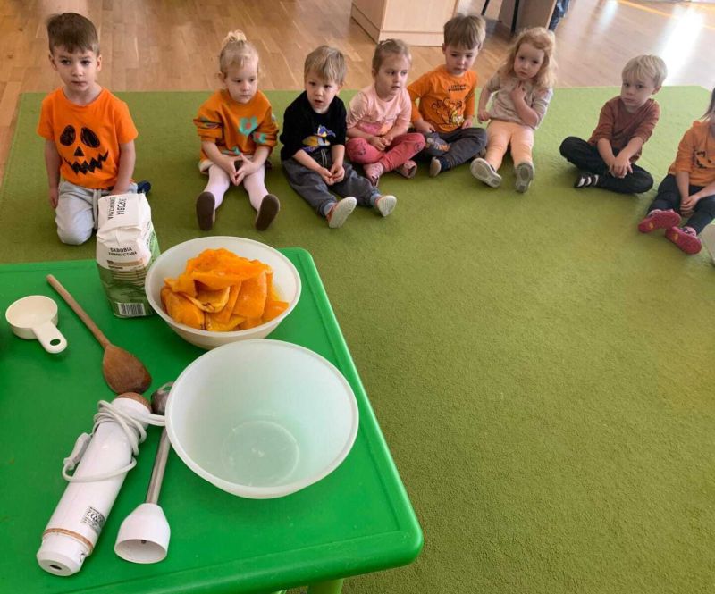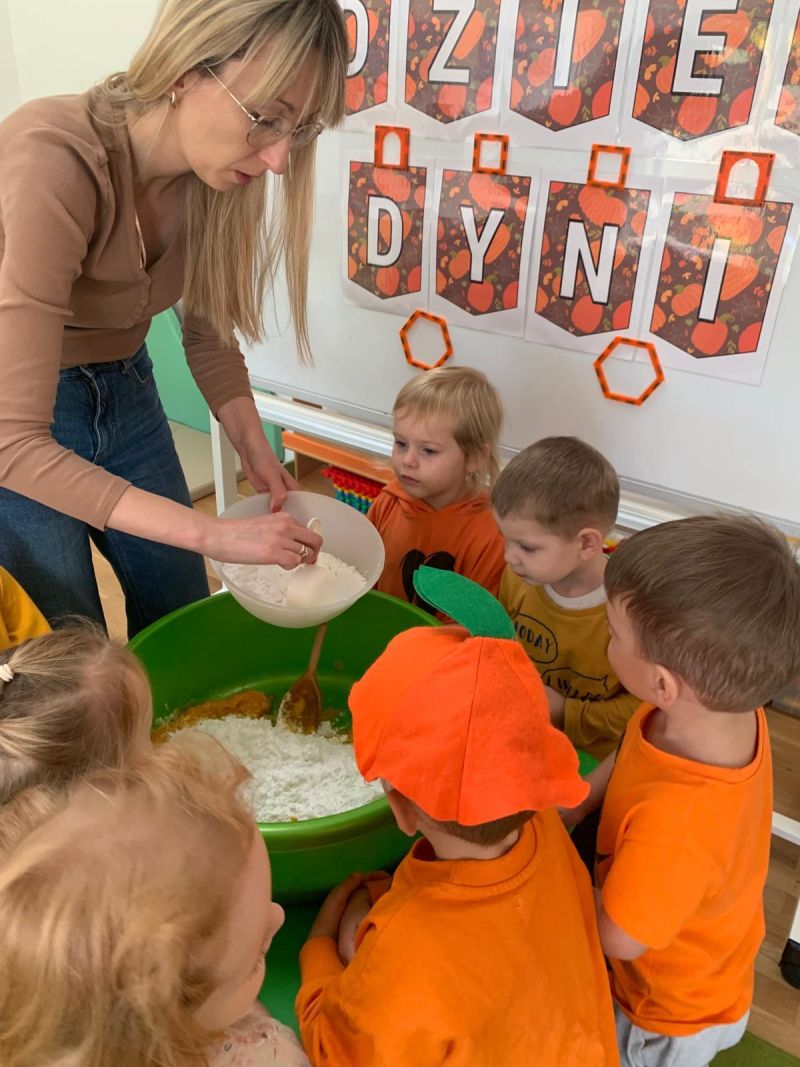 31 października podczas Dnia Dyni dzieci poznały, jak wygląda dynia – oglądały jej kształt, kolor i zapach. Następnie wspólnie przygotowały „dyniolinę”.