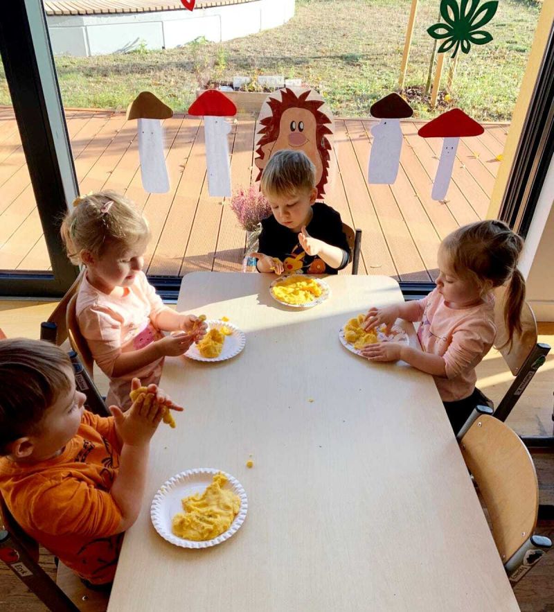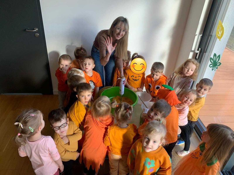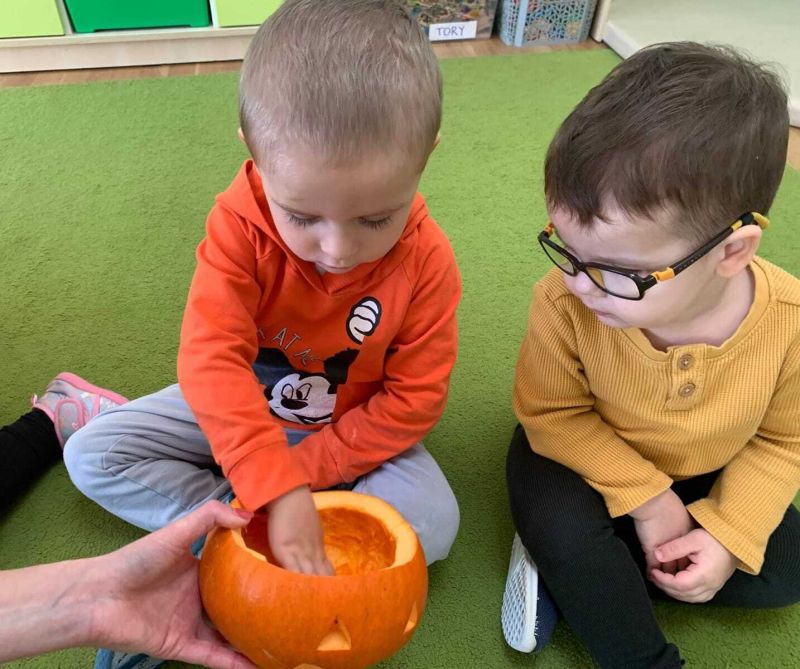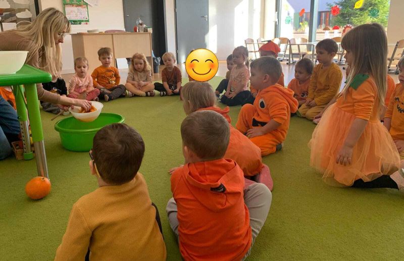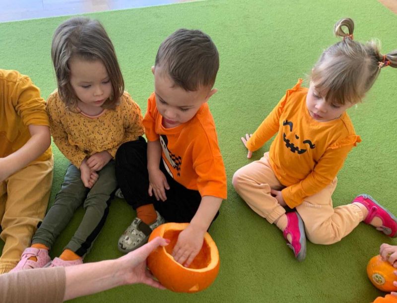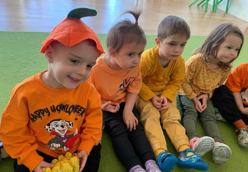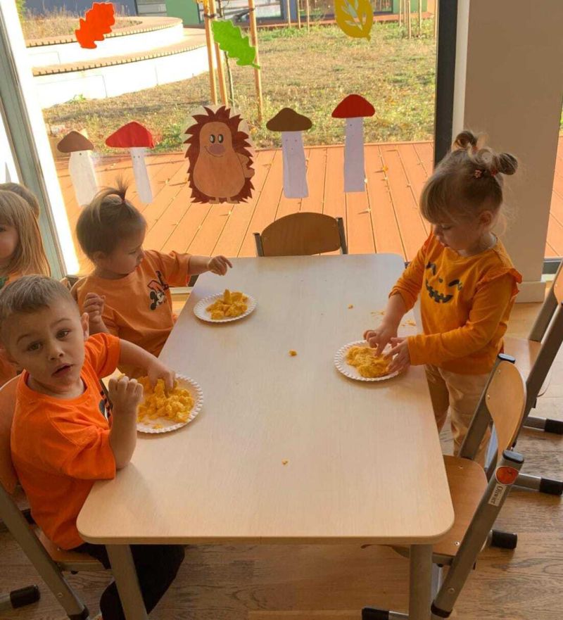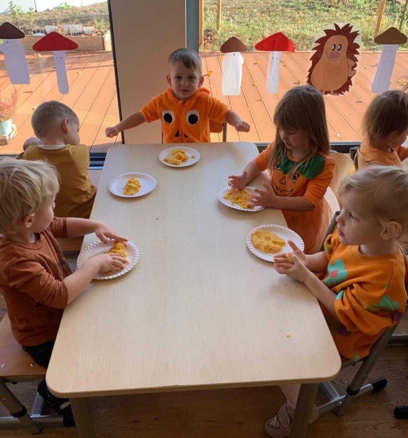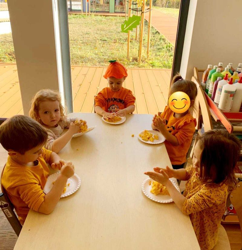 31 października podczas Dnia Dyni dzieci poznały, jak wygląda dynia – oglądały jej kształt, kolor i zapach. Następnie wspólnie przygotowały „dyniolinę”.