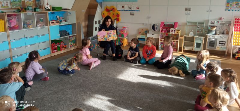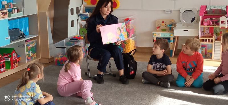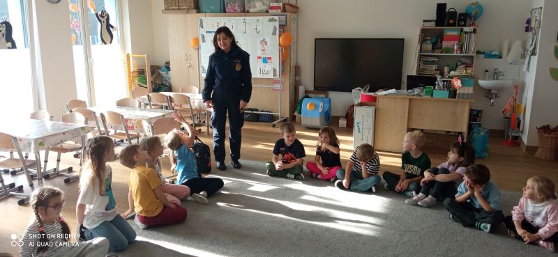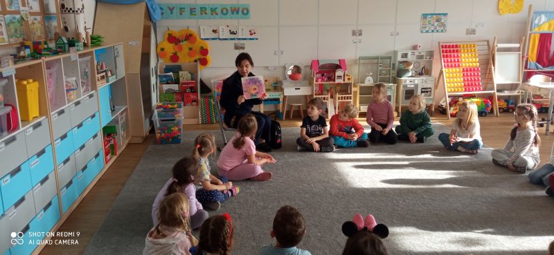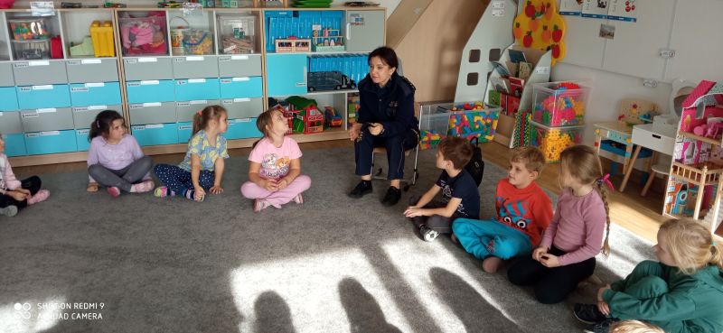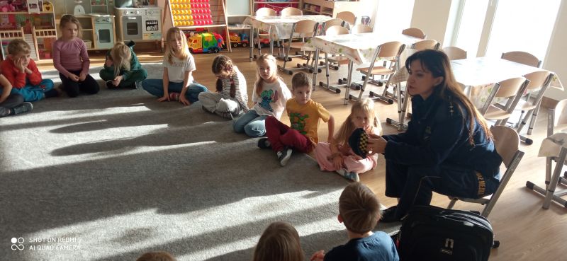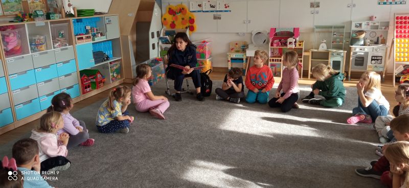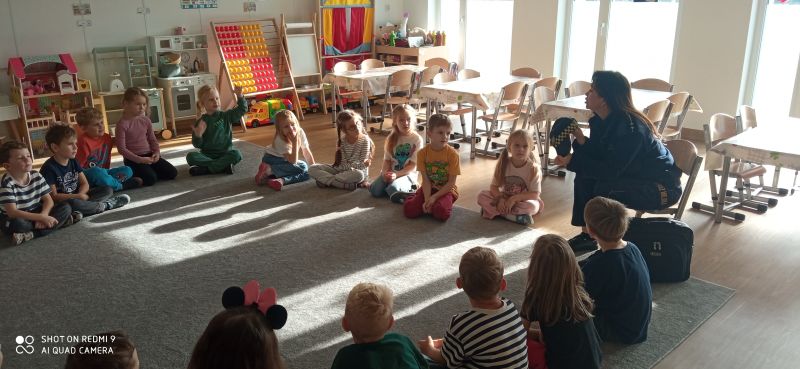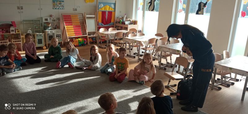 Grupę Kreciki odwiedziła pani ze Straży Miejskiej, która opowiadała naszym przedszkolakom, jak należy zachować się w sytuacji, gdy ktoś się zgubi.