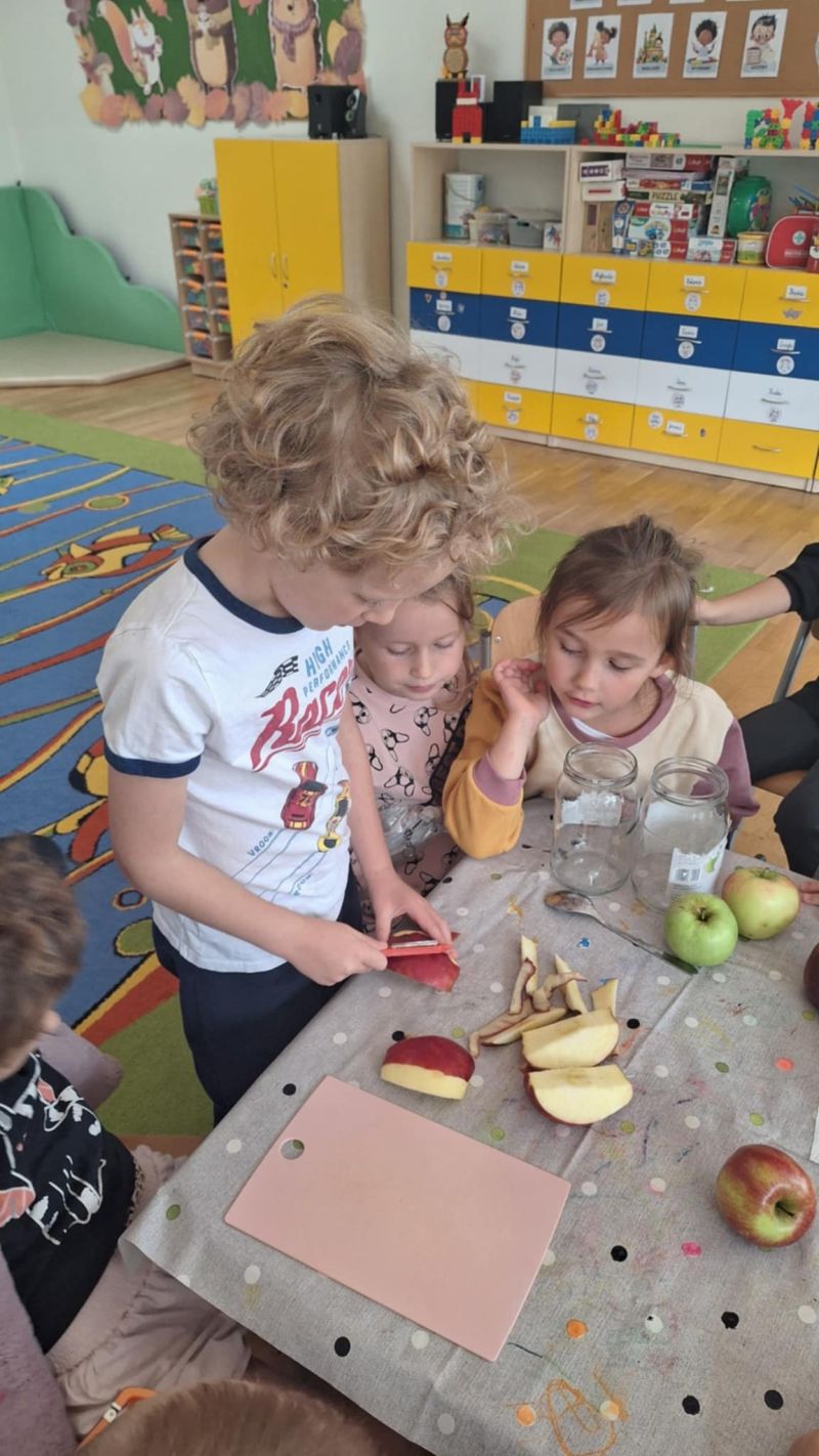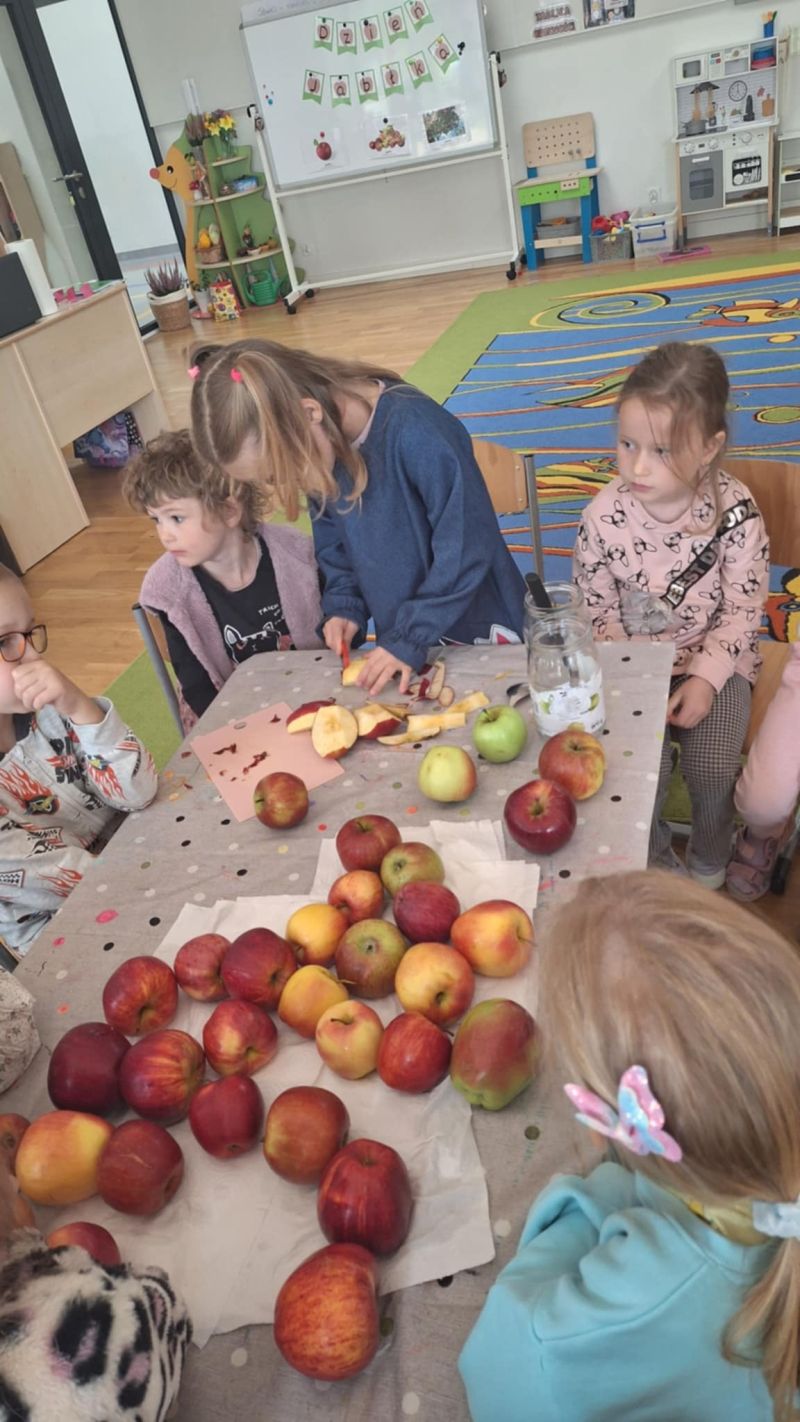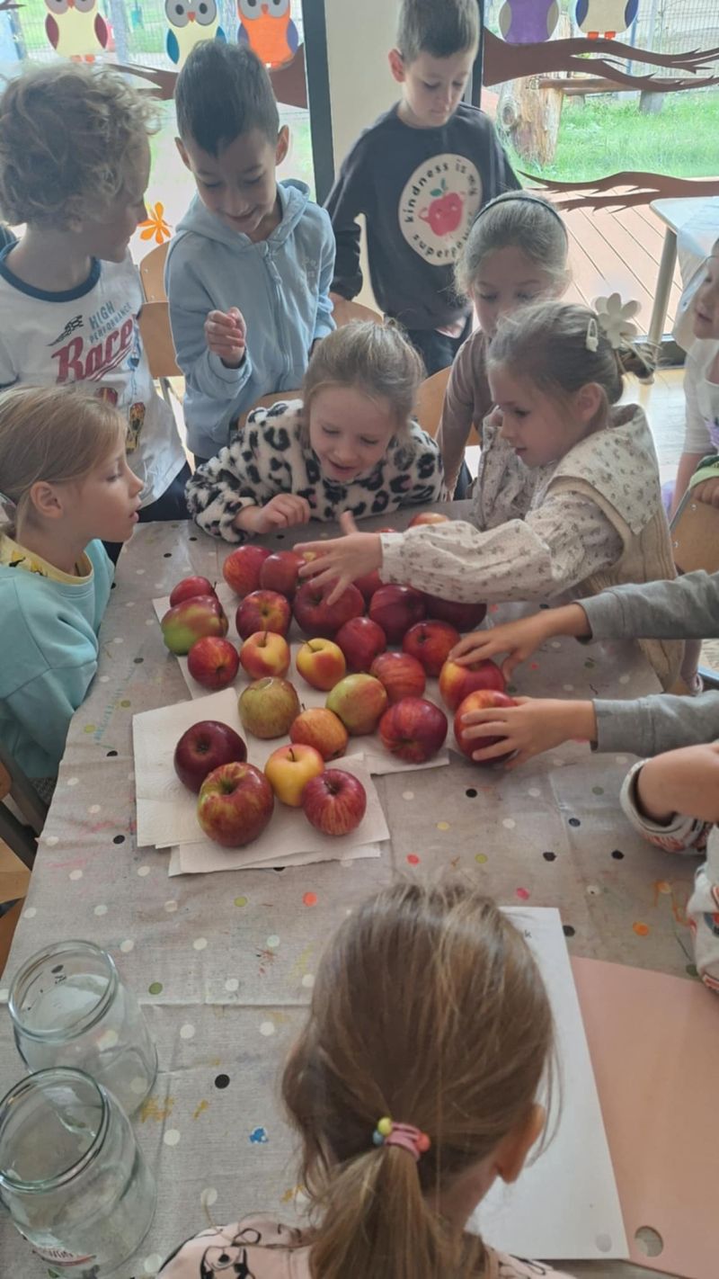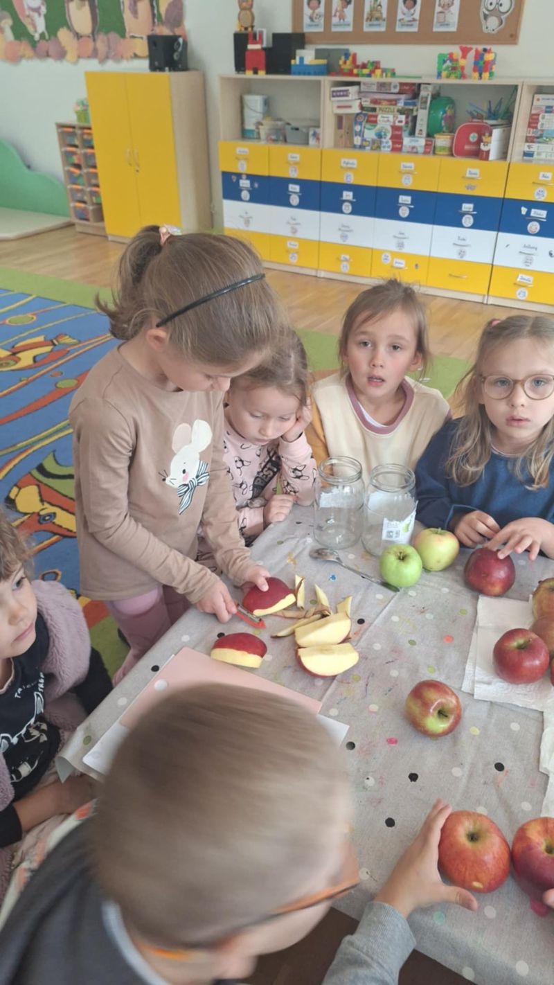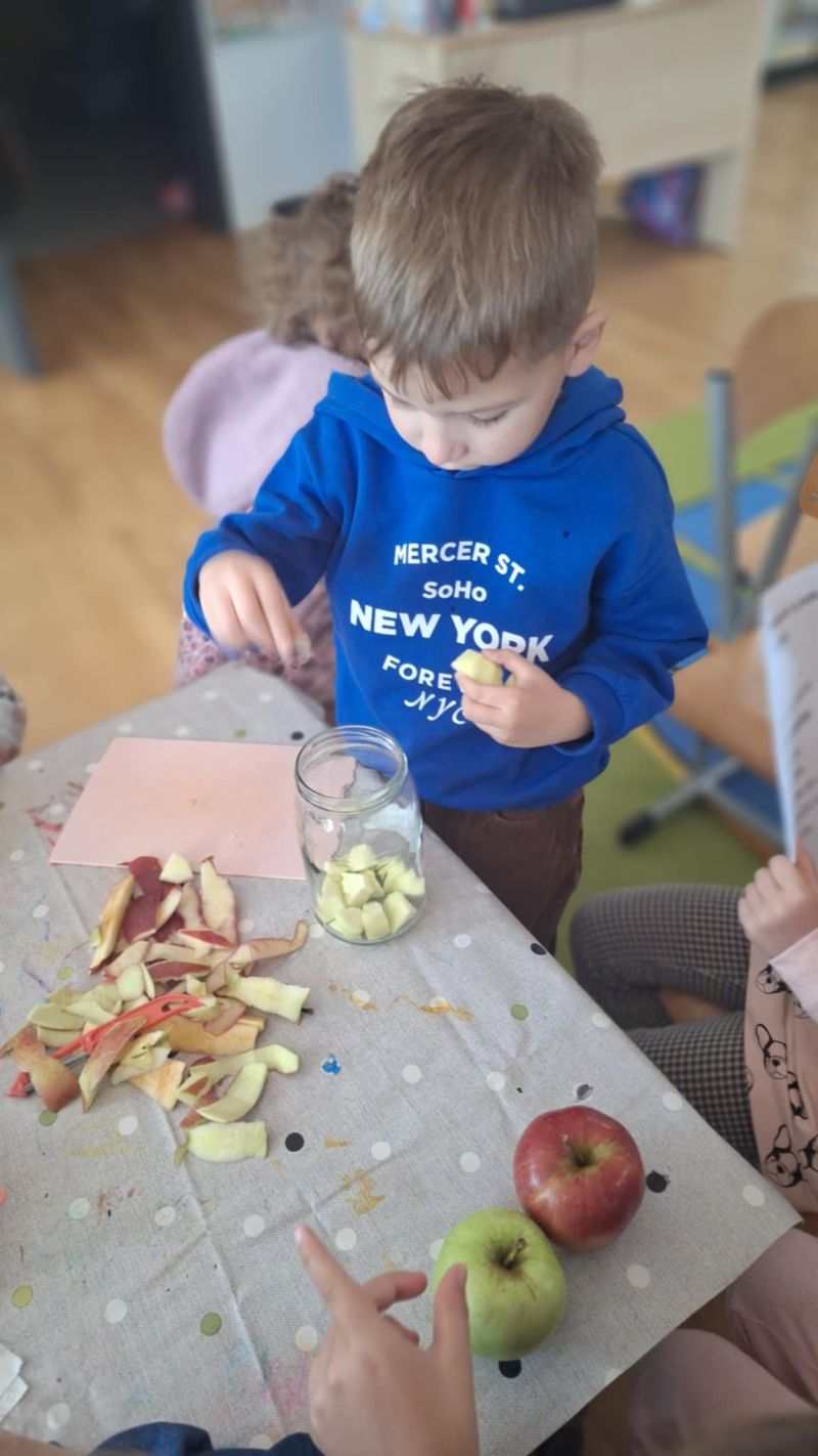 Tego dnia sprawdziliśmy królowały zabawy z jabłkiem. Sprawdziliśmy czy trudno się je obiera i kroi, wykonaliśmy przepyszny kompot oraz sprawdziliśmy czy z jabłek można robić pieczątki.