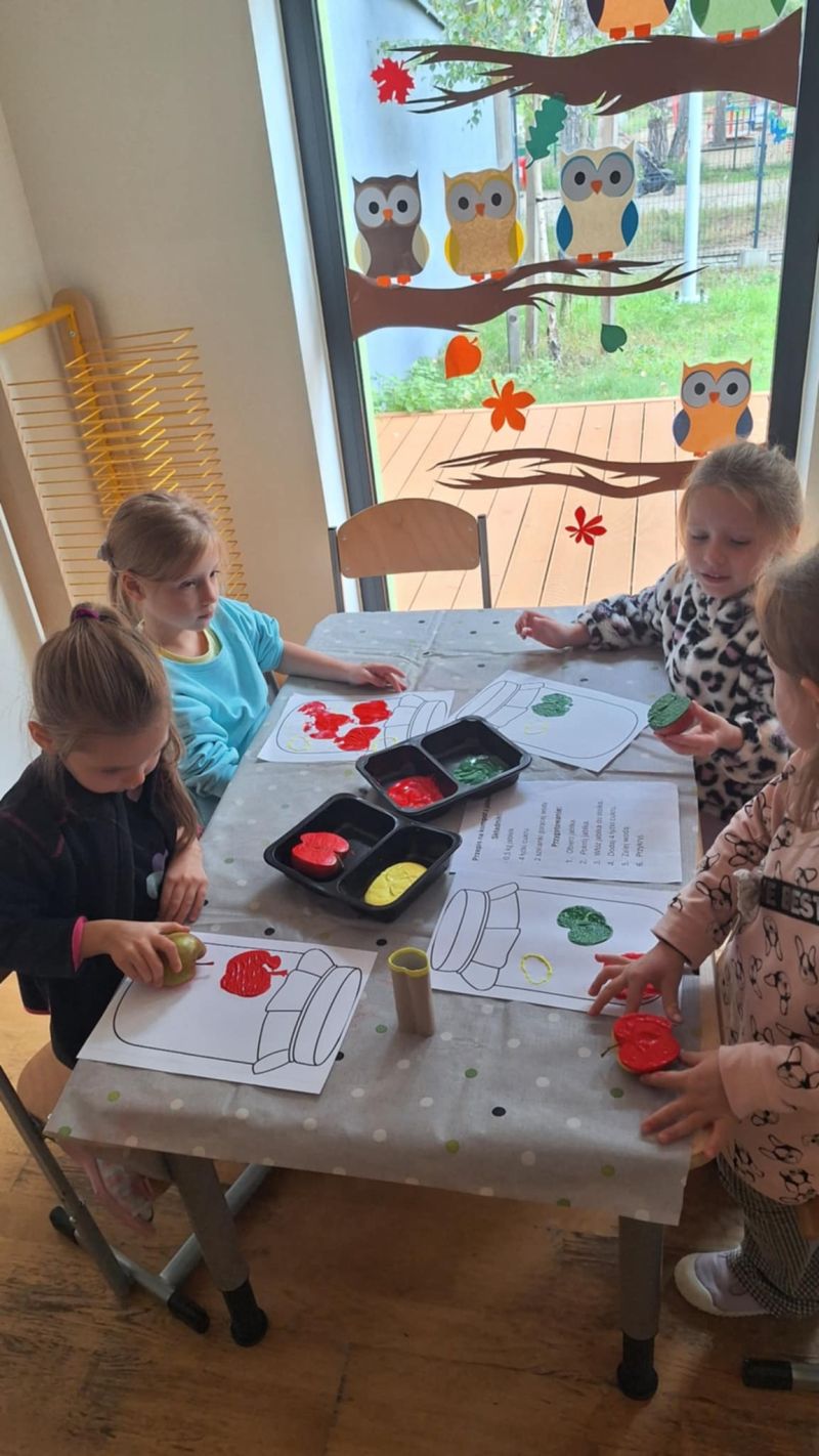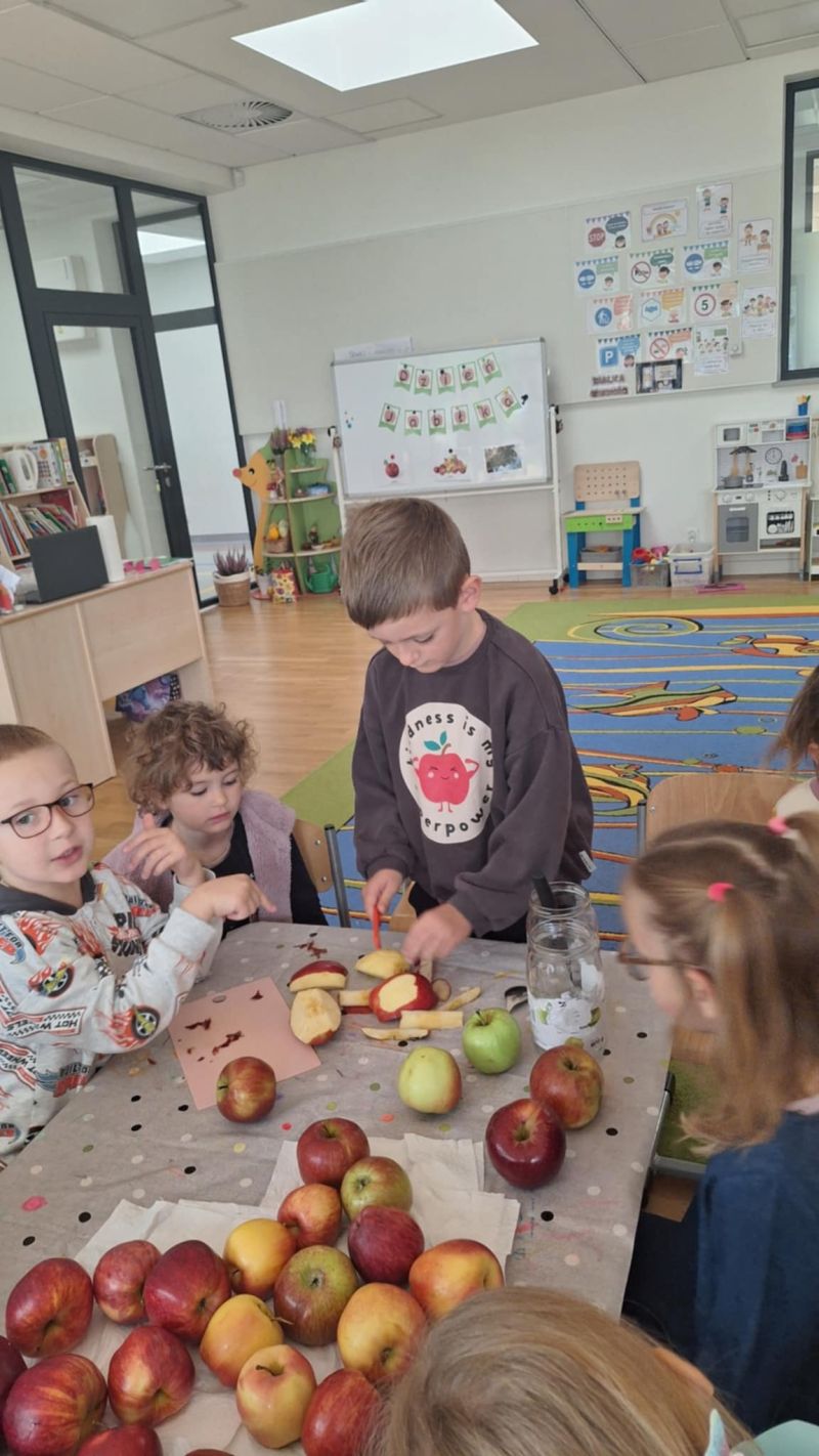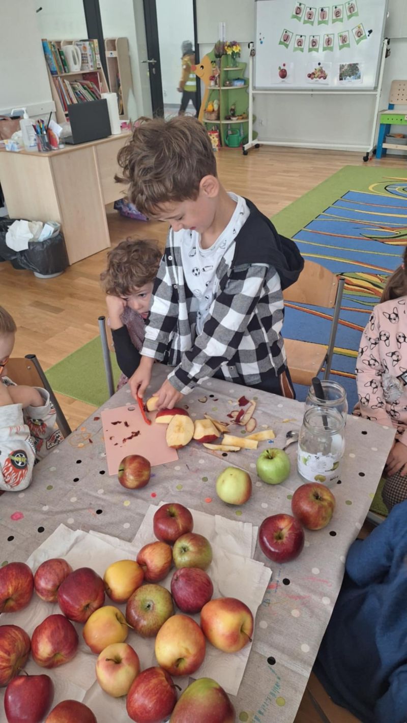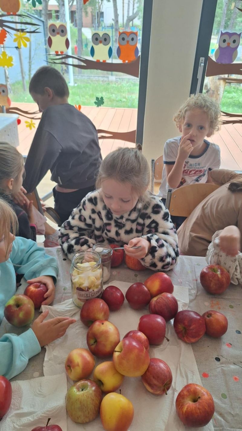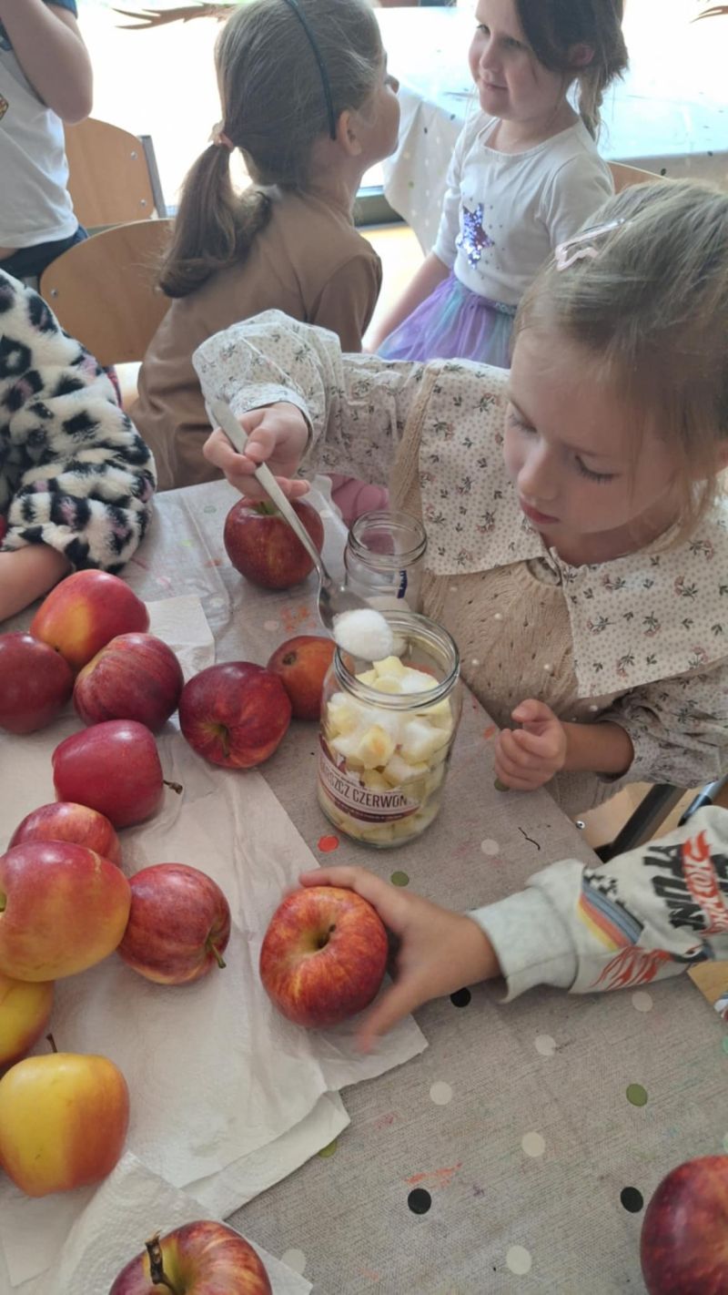Tego dnia sprawdziliśmy królowały zabawy z jabłkiem. Sprawdziliśmy czy trudno się je obiera i kroi, wykonaliśmy przepyszny kompot oraz sprawdziliśmy czy z jabłek można robić pieczątki.