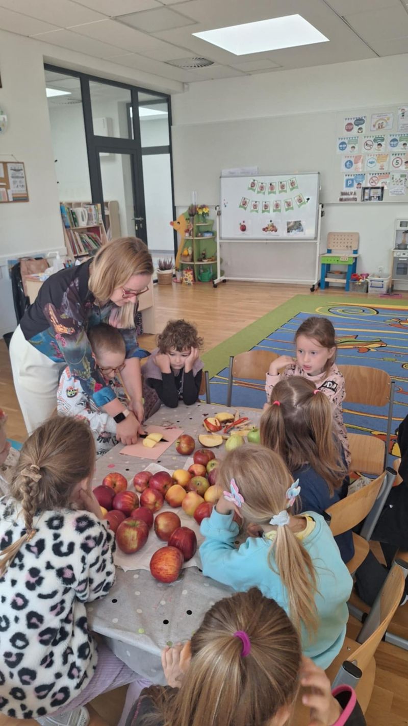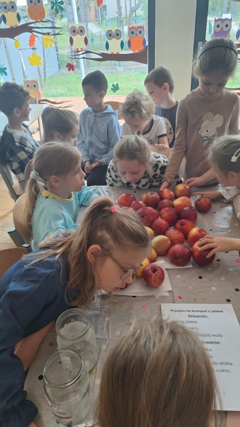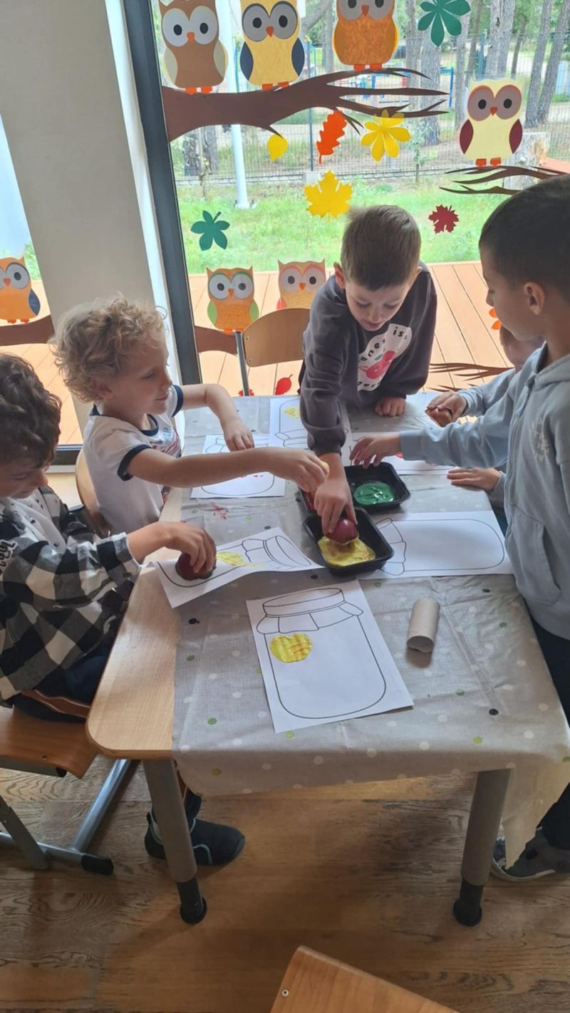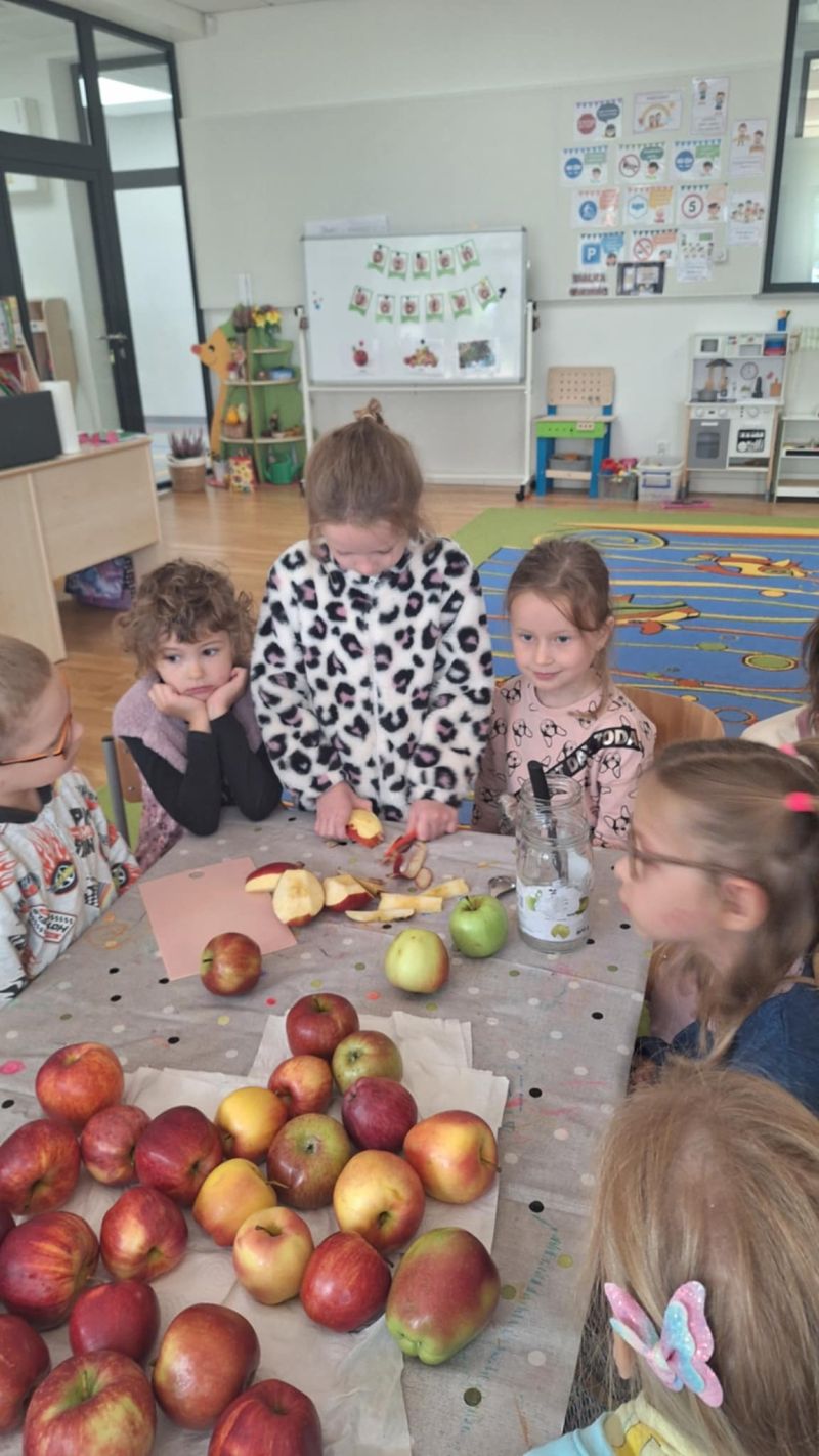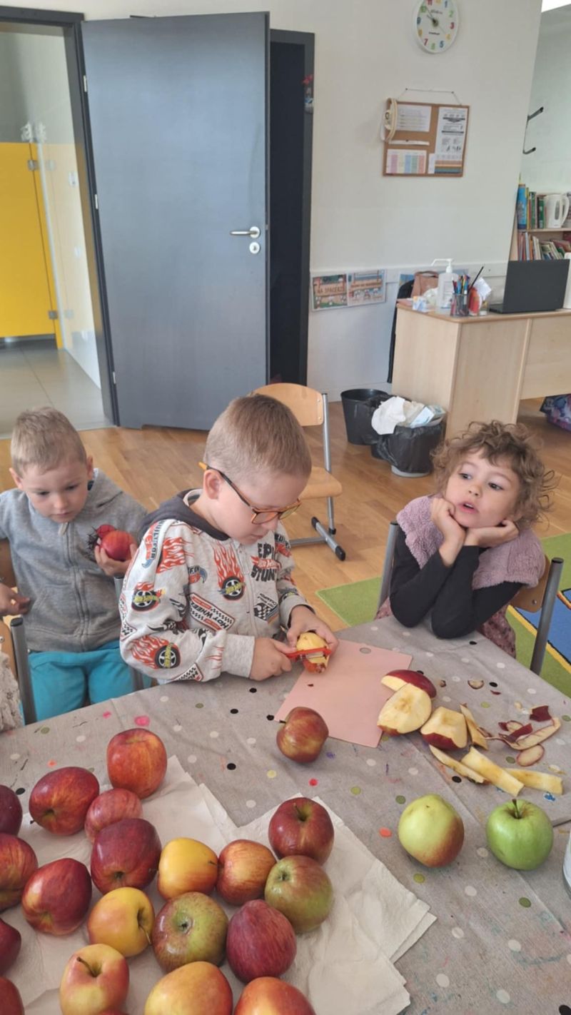 Tego dnia sprawdziliśmy królowały zabawy z jabłkiem. Sprawdziliśmy czy trudno się je obiera i kroi, wykonaliśmy przepyszny kompot oraz sprawdziliśmy czy z jabłek można robić pieczątki.