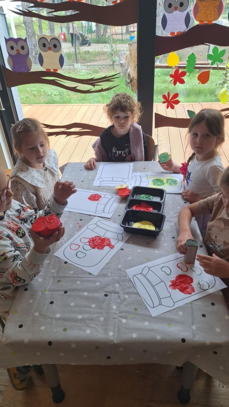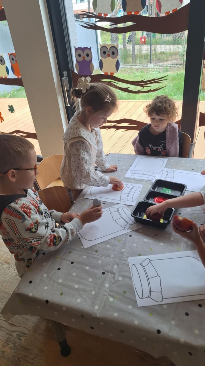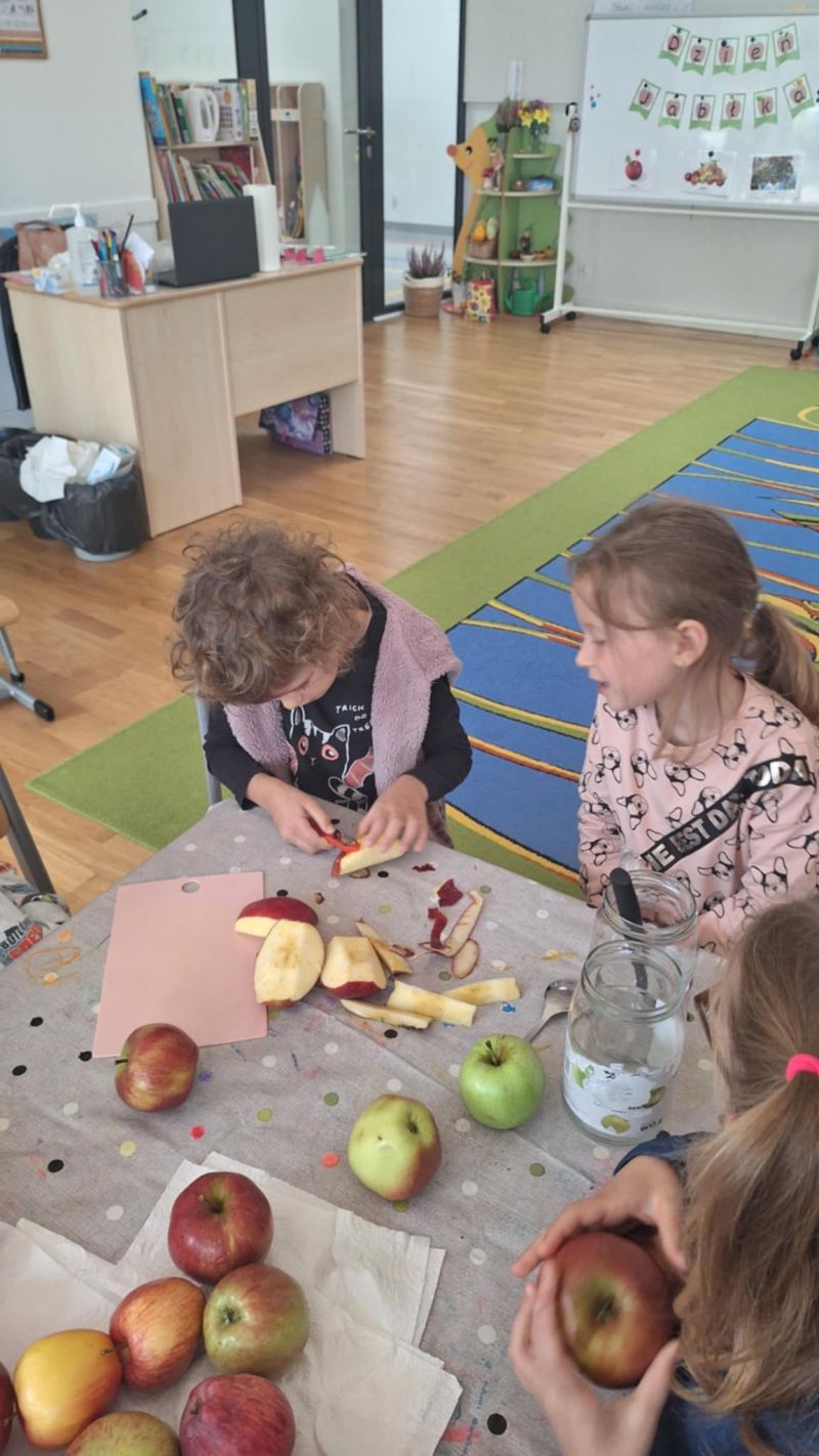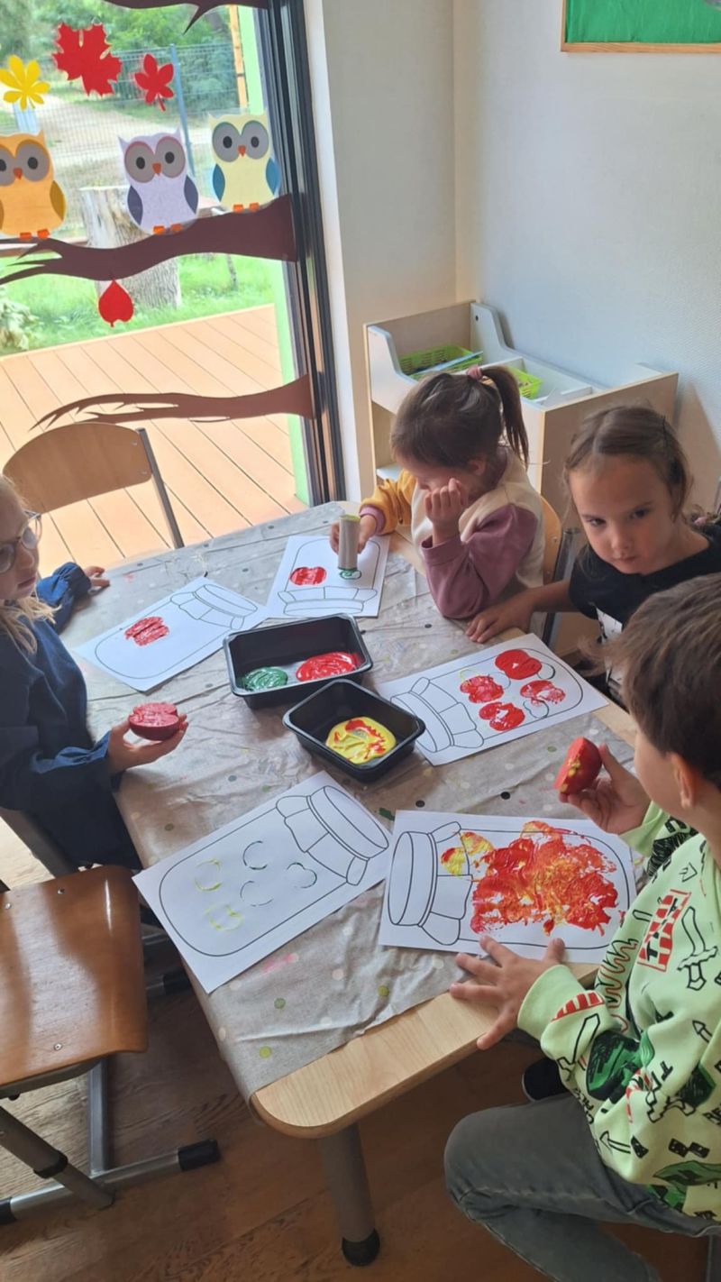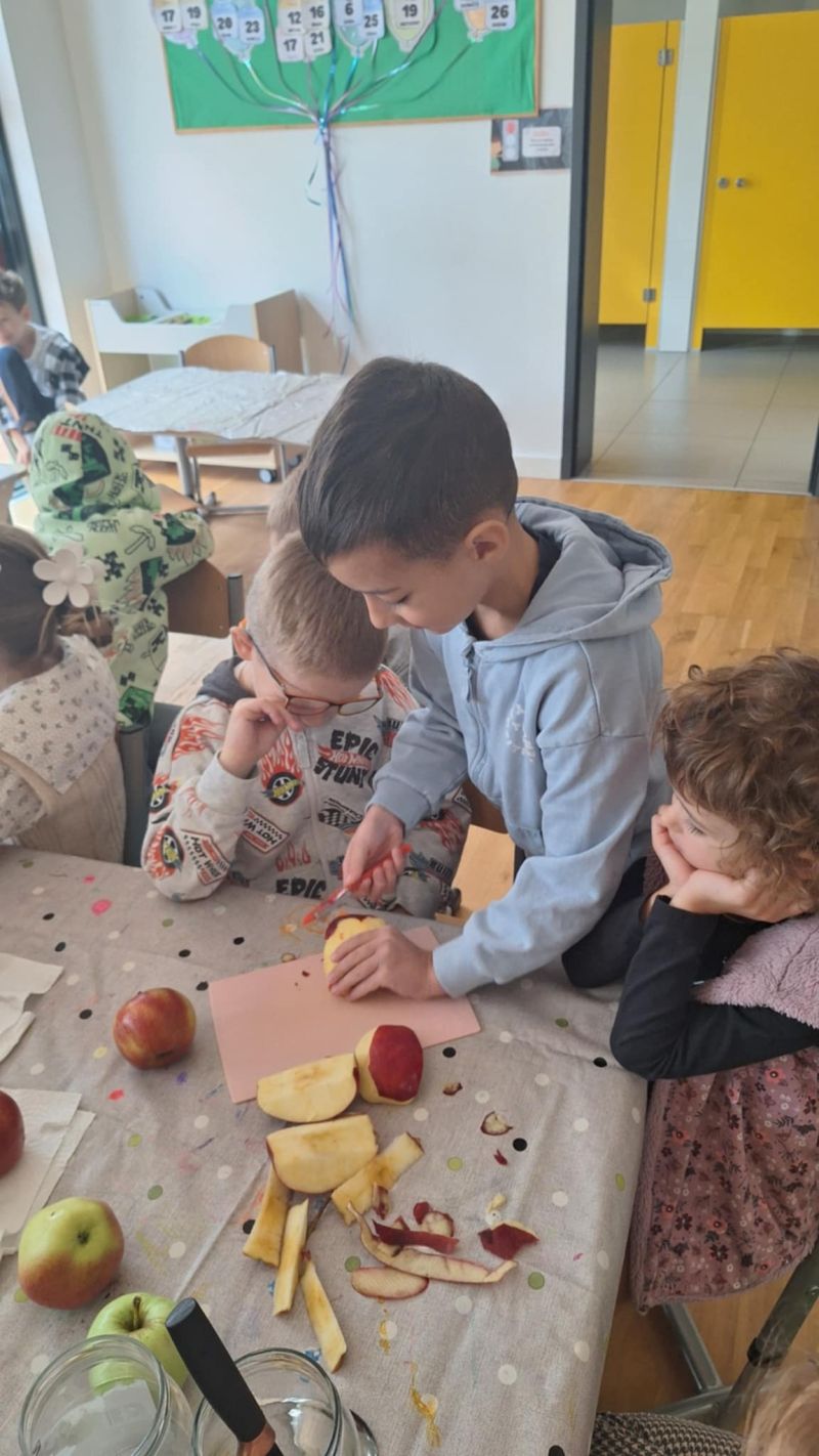 Tego dnia sprawdziliśmy królowały zabawy z jabłkiem. Sprawdziliśmy czy trudno się je obiera i kroi, wykonaliśmy przepyszny kompot oraz sprawdziliśmy czy z jabłek można robić pieczątki.