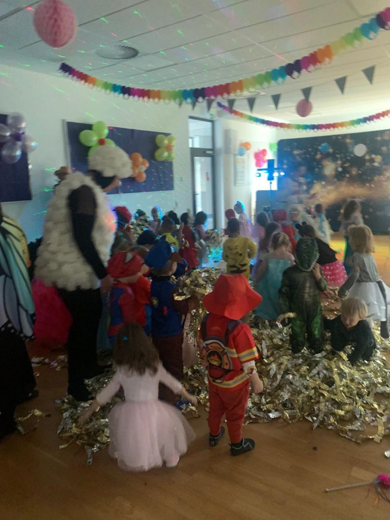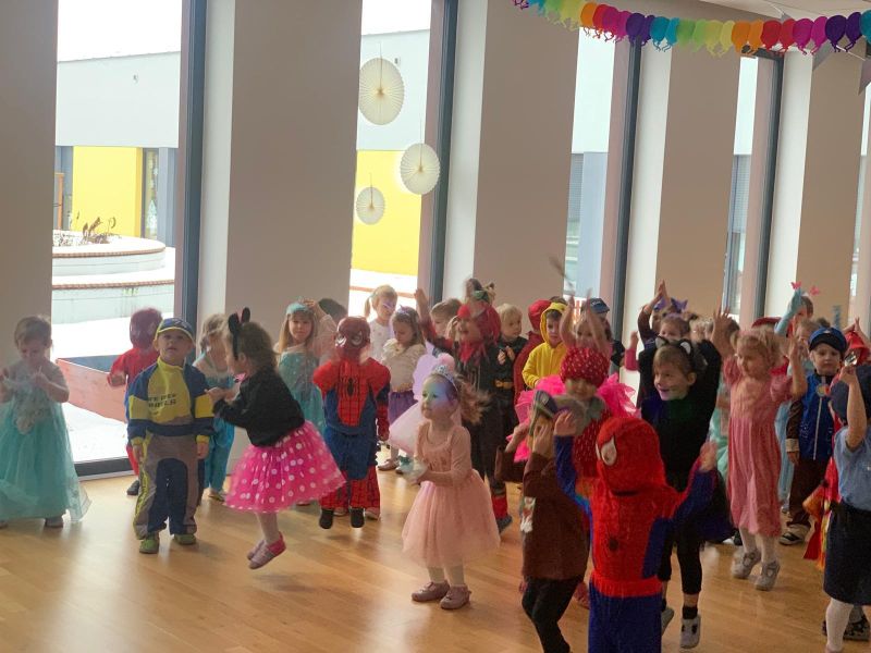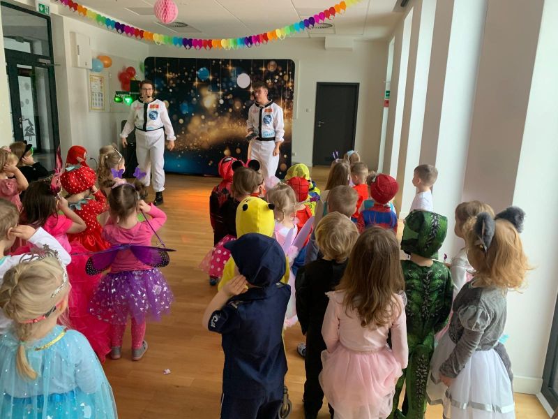 Dzieci w kolorowych strojach z radością uczestniczyły w tańcach i zabawach przy muzyce.
