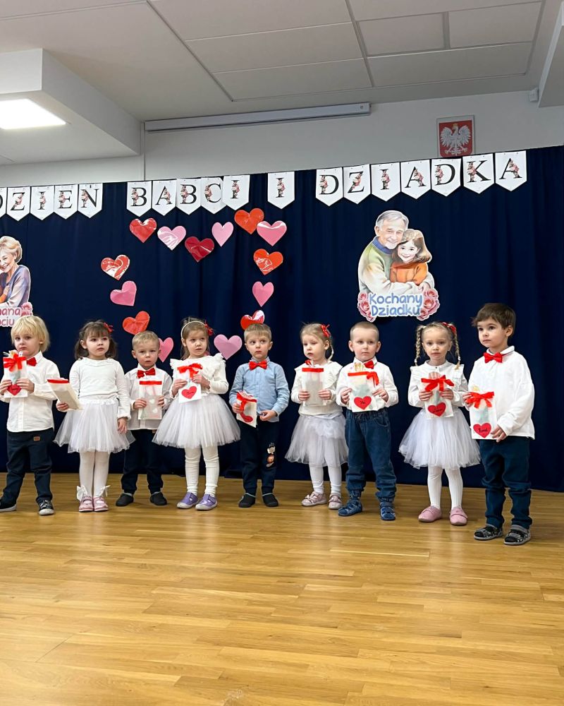 Dnia 29 stycznia 2026 roku obchodziliśmy wspólnie święto naszych babć i dziadków. Zaproszeni goście mieli okazję obejrzeć wspaniały występ w wykonaniu wnucząt, które zatańczyły i zaśpiewały oraz wyrecytowały wiersze z okazji dnia babci i dziadka. Po uroczystości integrowaliśmy się wspólnie przy pysznym poczęstunku!