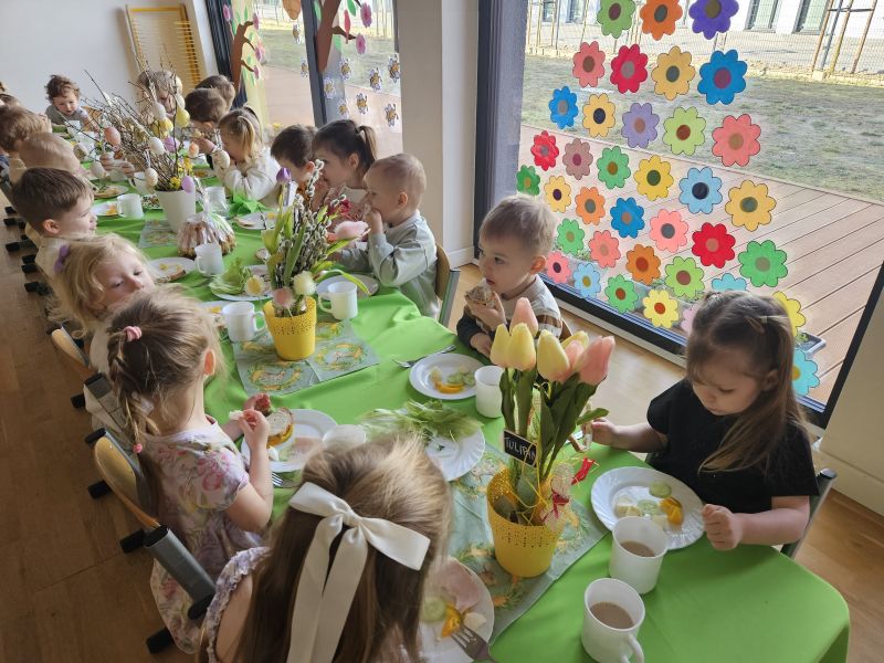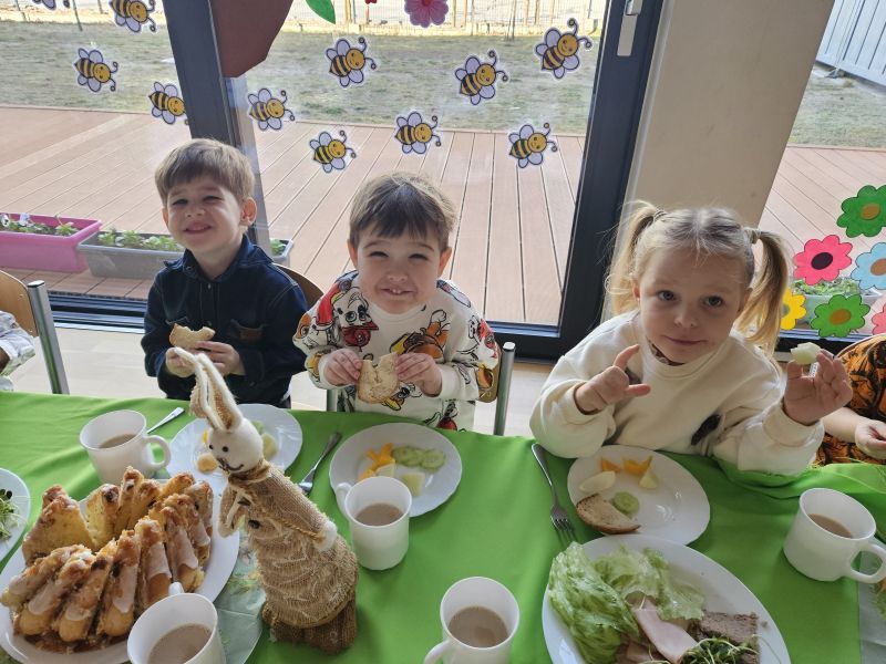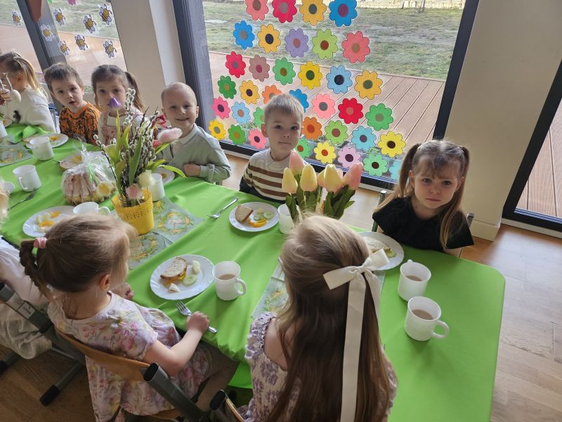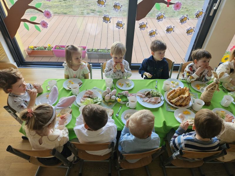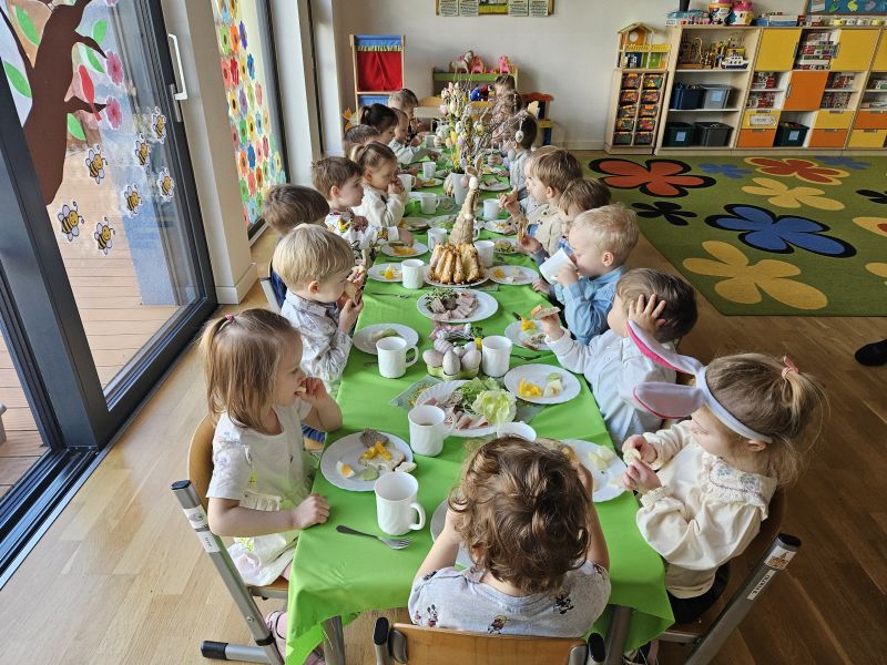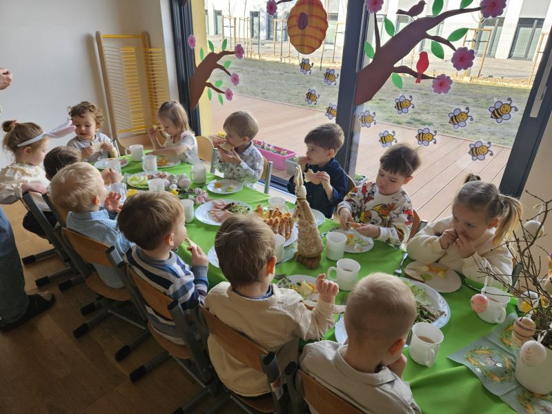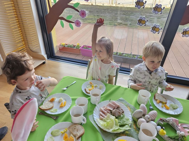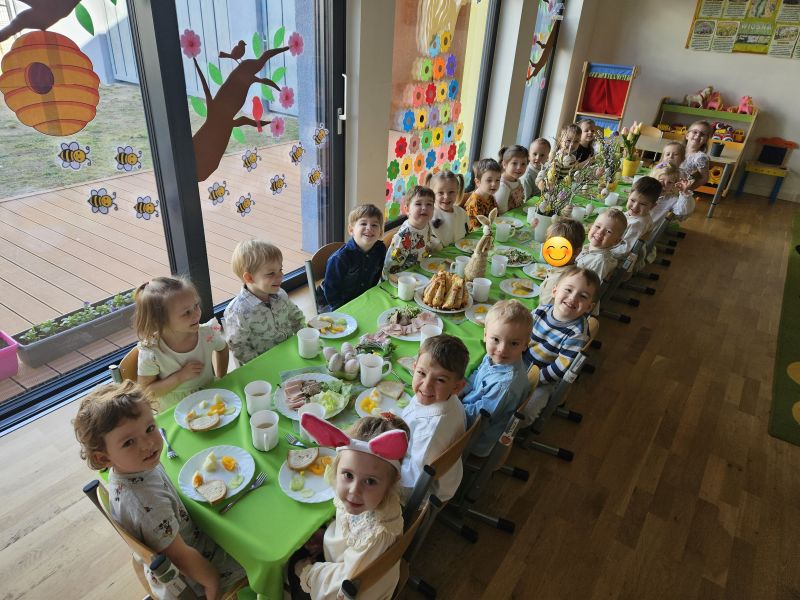 Pszczółki w radosnej, świątecznej atmosferze zasiadły do wspólnego Wielkanocnego śniadania. Na stole nie zabrakło tradycyjnych przysmaków, kolorowych dekoracji i wiosennego nastroju.