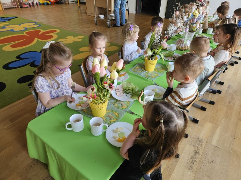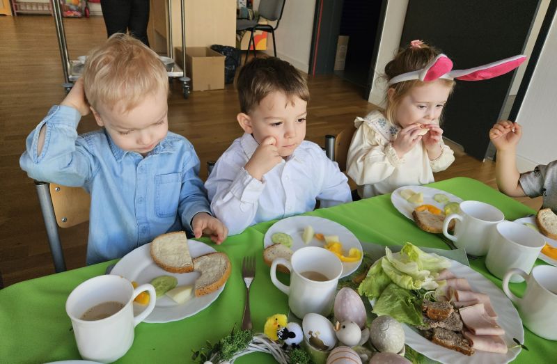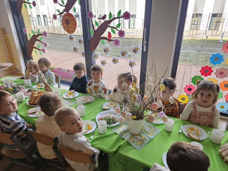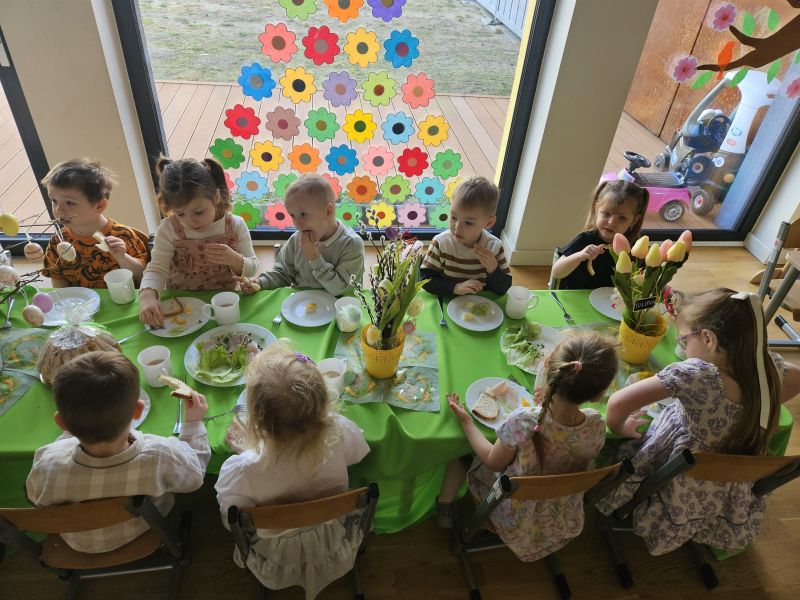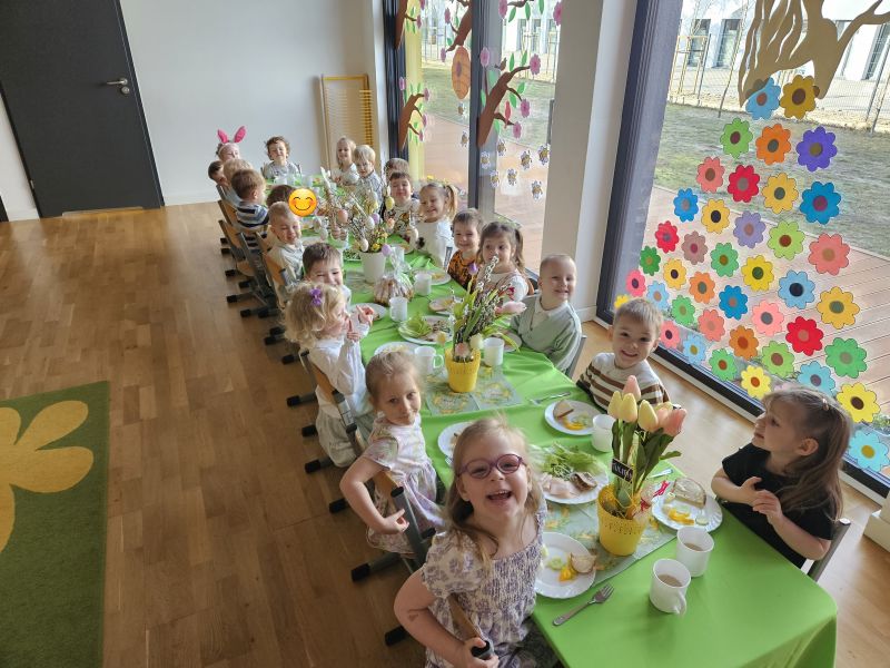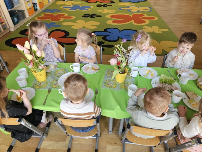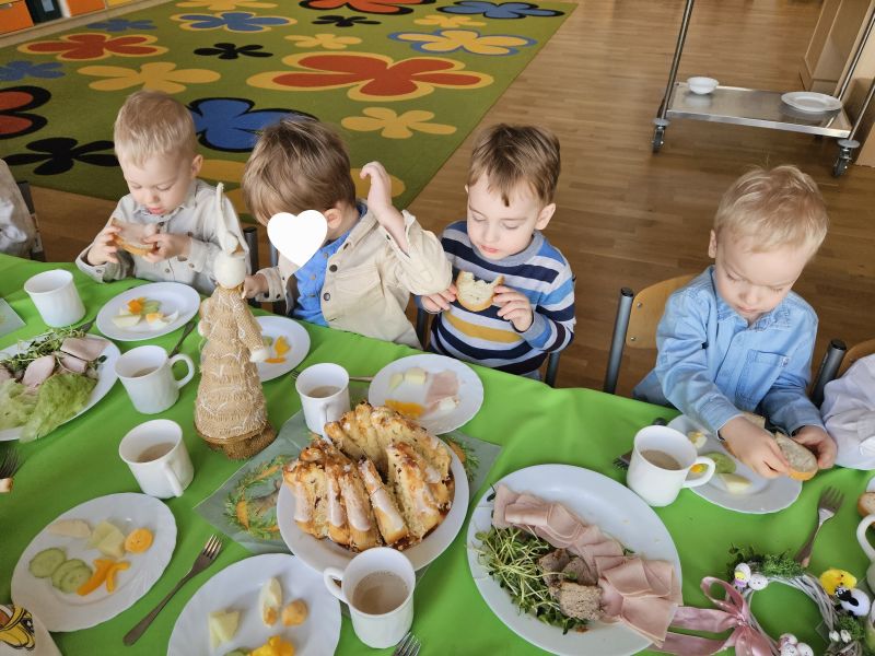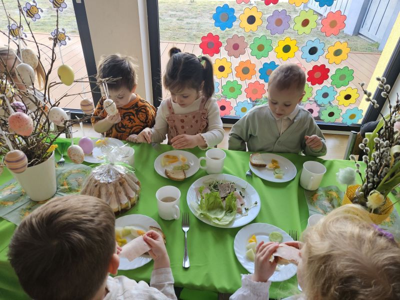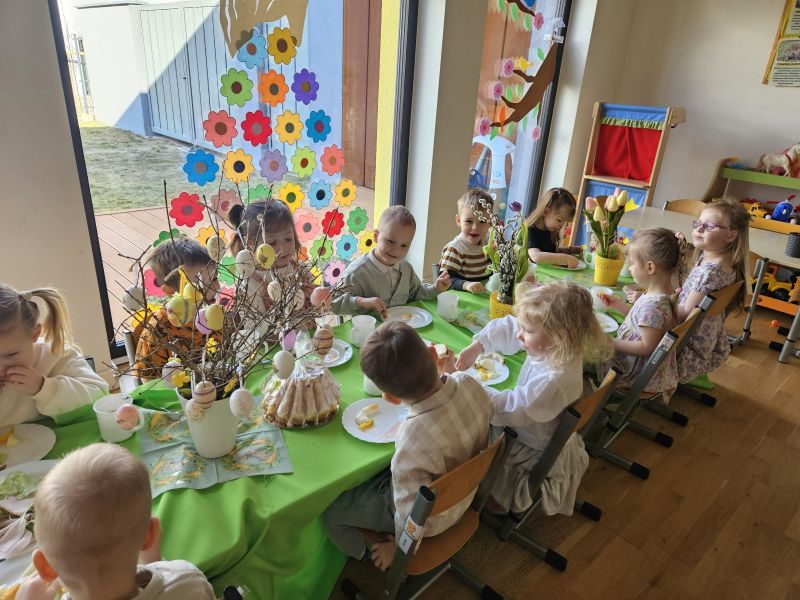 Pszczółki w radosnej, świątecznej atmosferze zasiadły do wspólnego Wielkanocnego śniadania. Na stole nie zabrakło tradycyjnych przysmaków, kolorowych dekoracji i wiosennego nastroju.